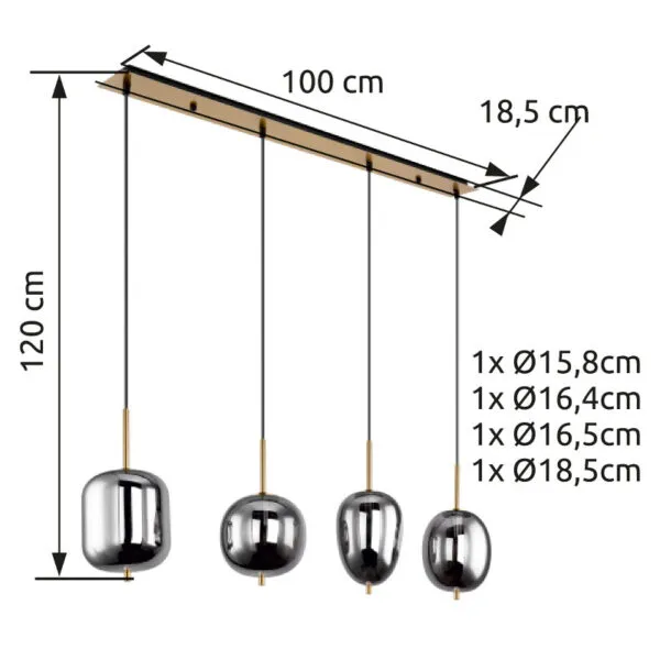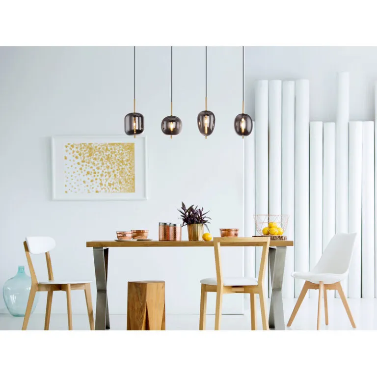 Zbog svog izduženog oblika, ova visilica može se divno postaviti preko trpezarijskog stola, koji potom doživljava jednoobrazno osvetljenje. Visilica je dugačka 110 cm sastoji se od pravougaone, mesingane metalne ploče na koju se kače četiri crna kabla sa okruglim, staklenim kuglama u boji dima različitih oblika. Visinu možete podesiti do 120 cm prilikom montaže. Takođe sadrži metalne elemente u boji mesinga, imate mogućnost odabira sijalica, grlo E14, što vam pruža mogućnost da pojedinačno odredite boju svetla i jačinu. Pomoću ove visilice možete postaviti elegantne akcente u enterijeru i upotpuniti celokupnu sliku.