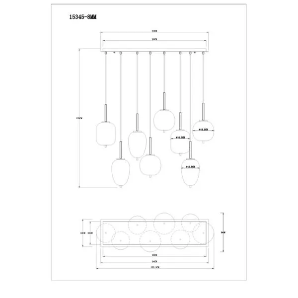 Ova visilica je divan dodatak vašem enterijeru. Visilica dugačka 102,5 cm sastoji se od pravougaone metalne ploče mesingane boje na koju se kači osam crnih kablova sa okruglim, staklenim kuglama u boji dima različitih oblika, visinu možete podesiti prilikom montaže do 120 cm. Oni su takođe obezbeđeni metalnim elementima mesingane boje i mogu biti opremljeni E14 sijalicama po vašem izboru, što vam pruža mogućnost da pojedinačno odredite boju svetla i jačinu. Pomoću ove visilice možete postaviti elegantne akcente u svoja četiri zida i upotpuniti celokupnu sliku.