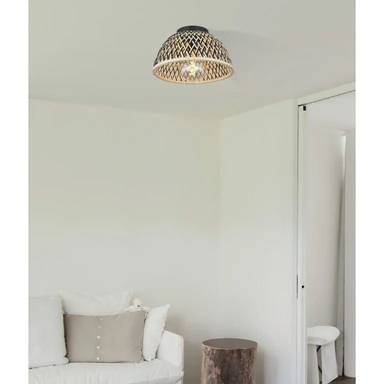 Ova prelepa plafonska lampa inspiriše sjajnim dizajnom. Iz okruglog plafoskog nosača istureno je grlo E27 koje je prekriveno oblikovanim abažurom (Ø35 cm) napravljenim od bambusa u sjajnim prirodnim bojama. Grlo E27 vam omogućava da sami odredite intenzitet svetlosti i jačinu do maksimalne snage od 40 vati. Zbog trajnosti i uštede energije preporučujemo LED sijalice.