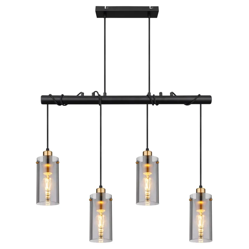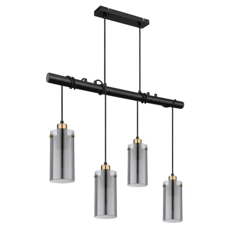 Ova prelepa visilica lampa FANNI serije kombinuje jednostavno sa modernim dizajnom. Sastoji se od četiri grla E27, svako sa cilindričnim abažurom (Ø10cm) u boji dima sa mesinganim ukrasima, koji se nastavljaju na crnim kablovima do crne grane dužine 85cm okačene na dva kabla 1,2m od plafona. Grla E27 vam omogućavaju da slobodno birate između sijalica do maksimalne snage od 40 vati. Uz ostale modele iz ove serije, možete ulepšati svoj dnevni boravak.