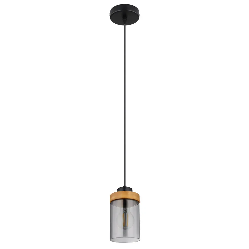 Predivna visilica sa cilindričnom nijansom od zadimljenog stakla (Ø10 cm) i drvenim ukrasima poseduje E27 utičnicu. Visi na crnoj matičnoj ploči okruglog oblika, sa kablom dugim 1,5 m od stropa. E27 utičnica vam omogućuje da izaberete sijalice do maksimalne snage od 60 vata.