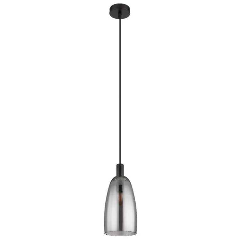 Ova elegantna visilica impresionira svojim prelepim dizajnom. Od okruglog plafonskog nosača, crni kabl dugačak 1,2 m prodire do grla E14, koje je opremljeno staklenim abažurom u boji dima (Ø 14 cm) i detaljima u crnoj boji. Grlo E14 vam omogućava da sami odredite boju svetla i jačinu do maksimalne snage od 40 vati. Zbog dugovečnosti i uštede energije preporučujemo LED sijalice.