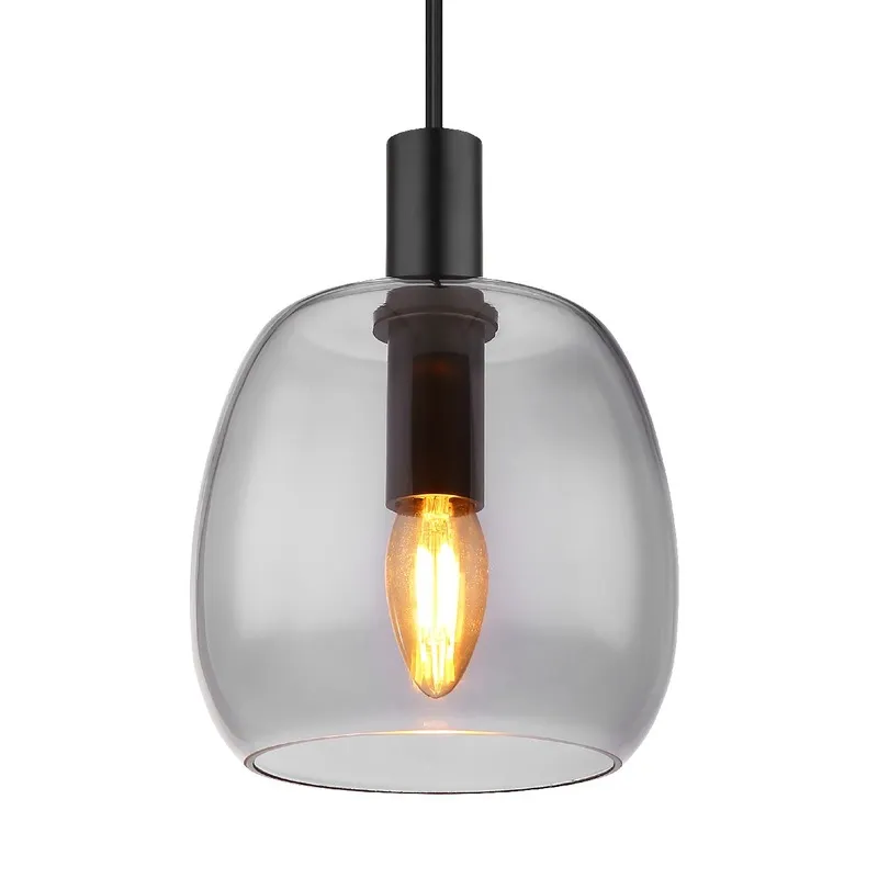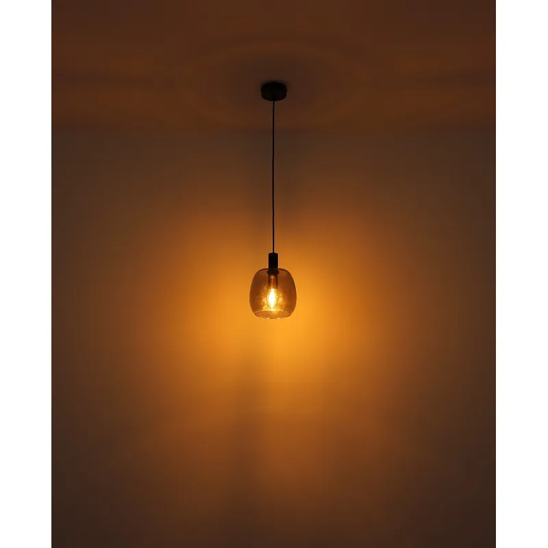 Ova elegantna visilica impresionira svojim prelepim dizajnom. Od okrugle plafonske osnove, crni kabl dugačak 1,2 m prodire do grla E14, koje je opremljeno staklenim abažurom u boji dima (Ø 16 cm). Grlo E14 vam omogućava da sami odredite boju svetla i jačinu do maksimalne snage od 40 vati. Zbog dugovečnosti i uštede energije preporučujemo LED sijalice.