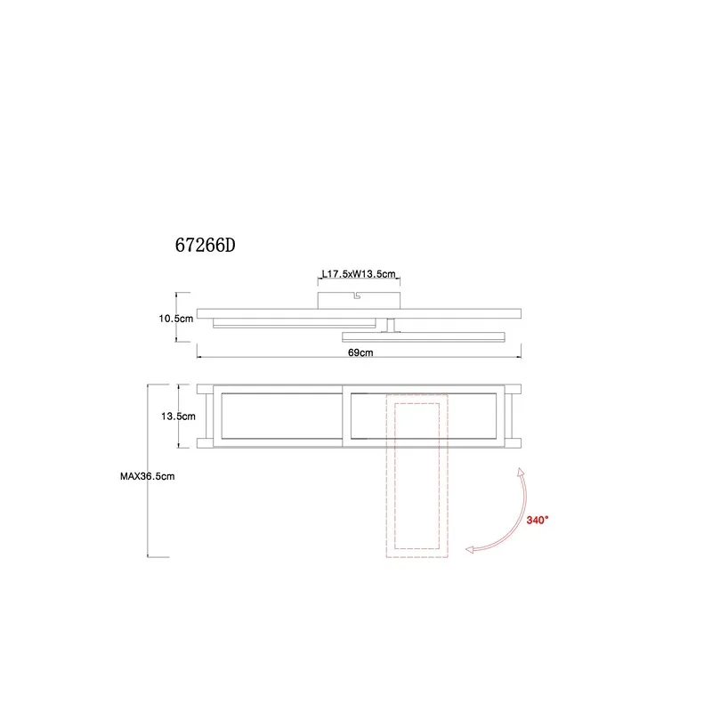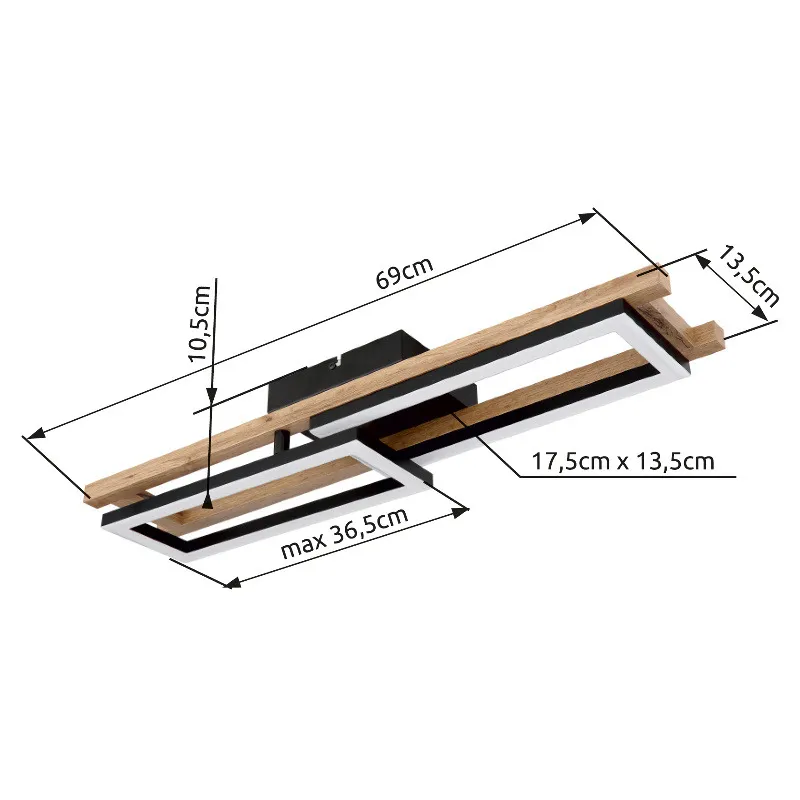 Ova moderna plafonska lampa serije ILLA inspiriše sjajnim dizajnom i postaje centar vaših soba. Na crnom mat plafonskom nosaču napravljenom od metala nalazi se okvir dugačak 69 cm nalik drvetu sa dva pravougaona LED panela. LED paneli od 20 vati i 850 lumena emituju toplo belu svetlost od 3000K i tako obezbeđuju prijatnu atmosferu.
