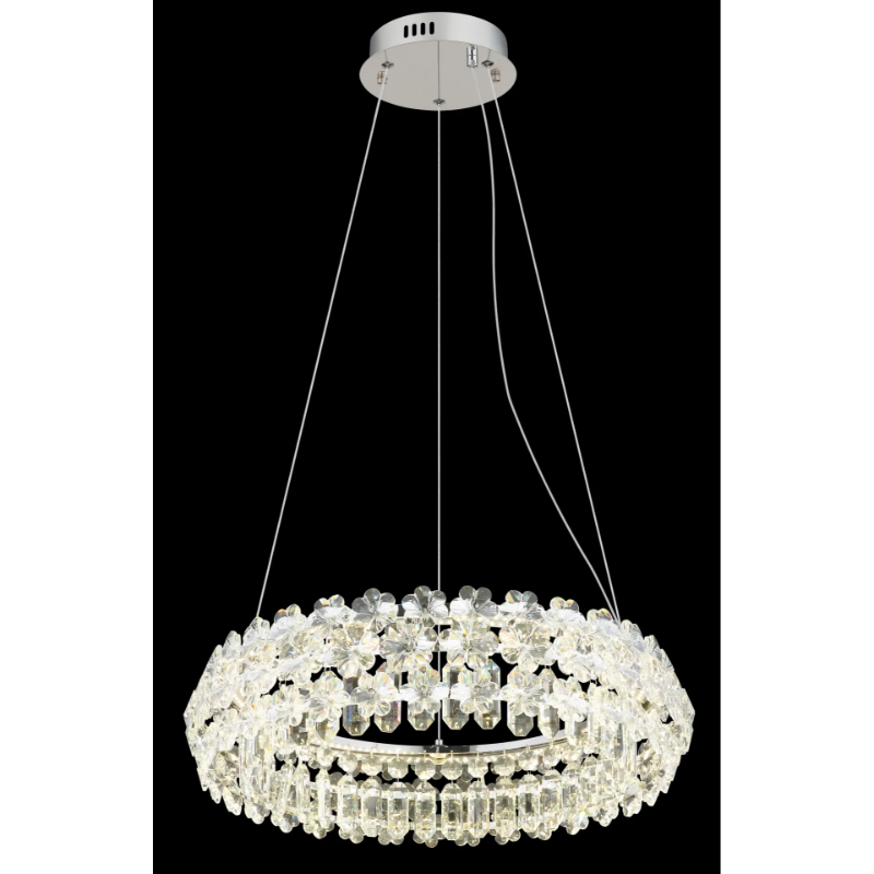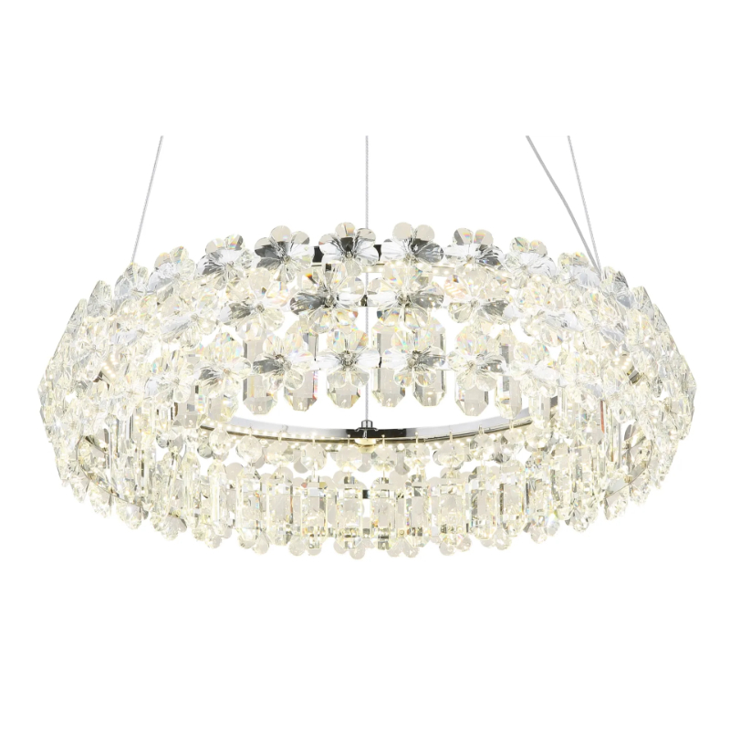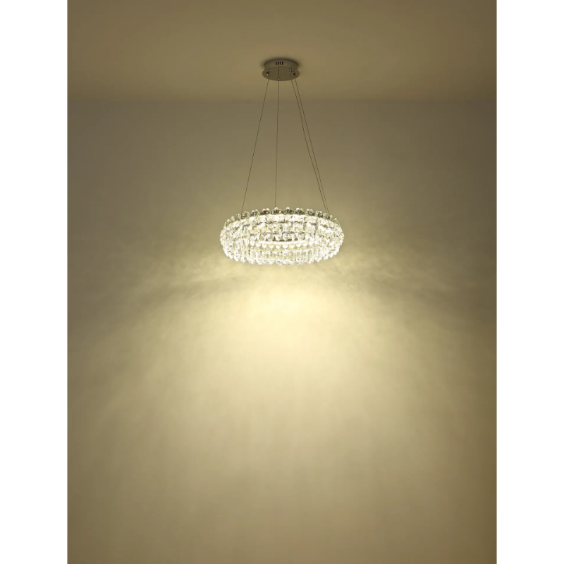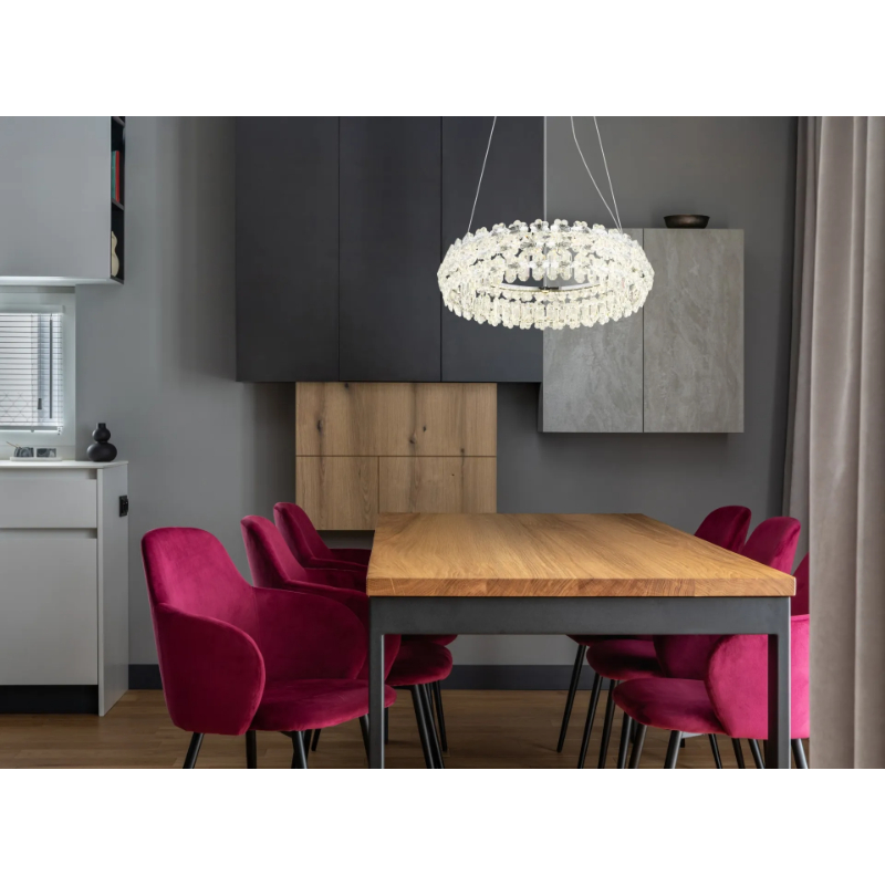 Kristalni luster DIANN 64140H unosi dašak luksuza u svaku prostoriju. Hromirano metalno telo i upečatljiv prsten od prozirnih K9 kristala stvaraju očaravajuću igru svetlosti koja je istovremeno moderna i tradicionalna. Sa prečnikom od 600 mm i izuzetnom snagom od 4460 lumena, ova svetiljka pruža ravnomerno i snažno osvetljenje.