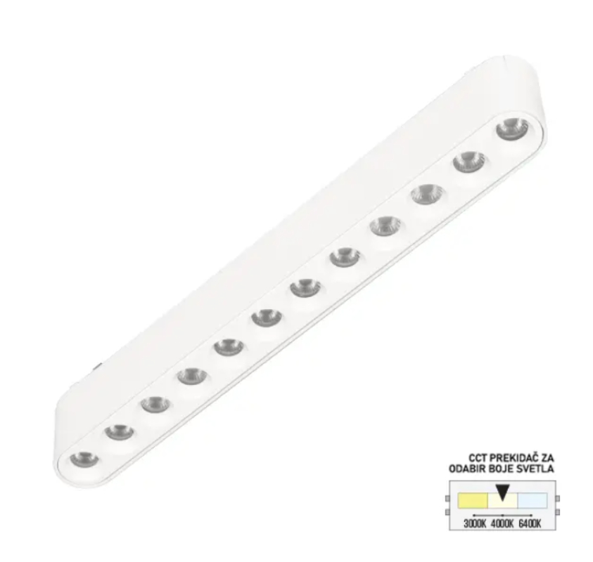 LED magnetna svetiljka cct ultra slim FMS2001-12 WH predstavlja moderno i funkcionalno rešenje za osvetljenje, namenjeno montaži na magnetnu ultra slim šinu. Zahvaljujući izduženom i tankom kućištu dimenzija 235x30x25mm. Izrađenom od aluminijuma i plastike u elegantnoj beloj boji, svetiljka se neupadljivo uklapa u svaki savremen enterijer, zadržavajući čist i minimalan estetski utisak.