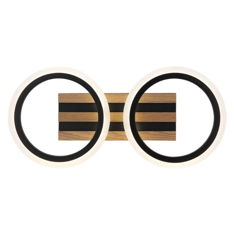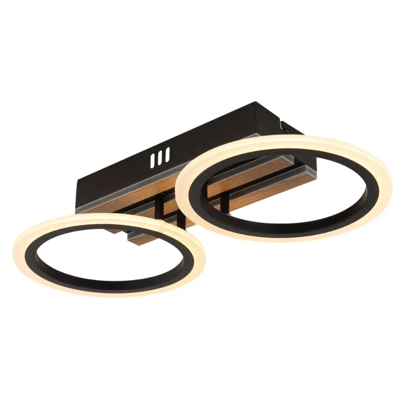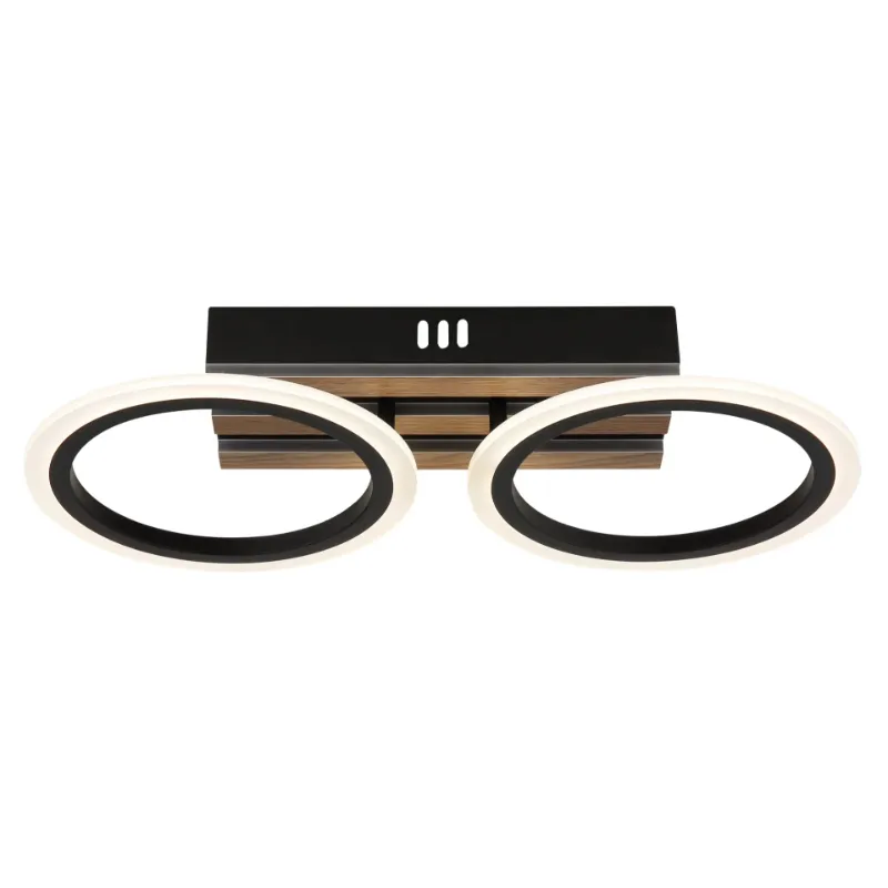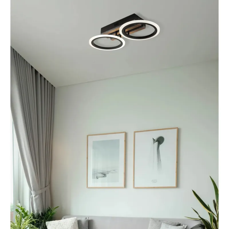 Plafonska lampa BLEVINS kombinuje savremeni dizajn sa funkcionalnim karakteristikama i postaje pravi akcenat u prostoru. Pravougaono telo od mat crnog metala savršeno je upotpunjeno detaljima od tamnog MDF-a u dekoru drveta, što lampi daje elegantan, a istovremeno topao izgled. Dva umetnički postavljena prstena unose savremenu i dinamičnu notu u dizajn.