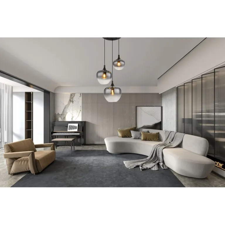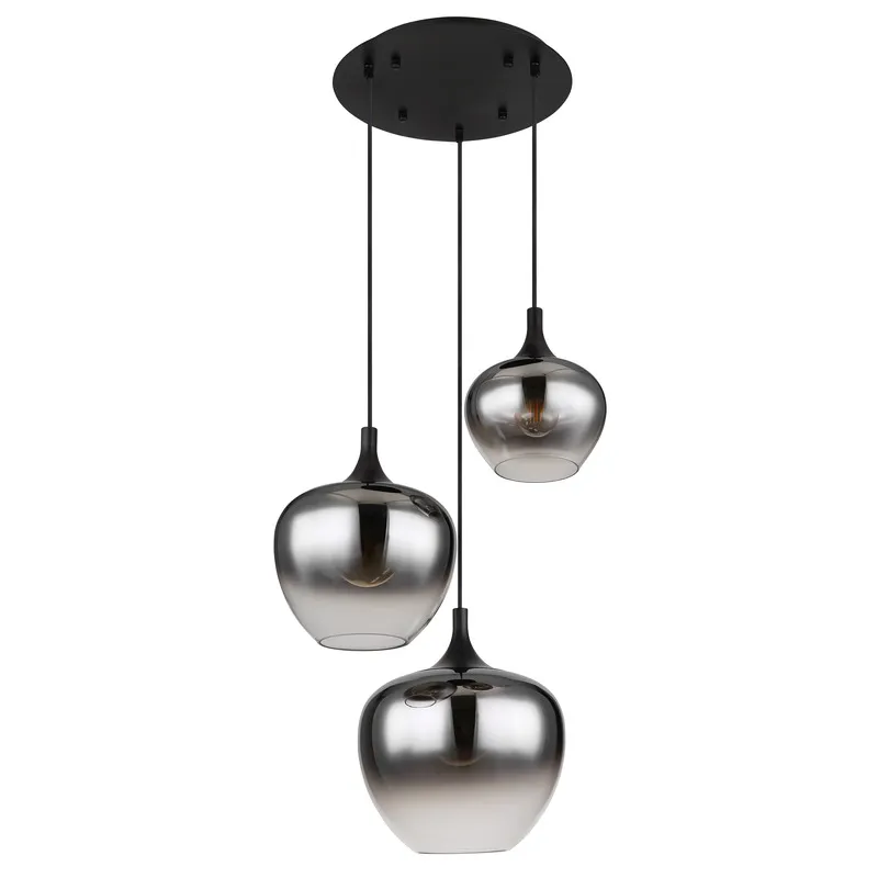 Ova prelepa visilica inspiriše sjajnim dizajnom. Iz okruglog plafonskog nosača (Ø 30 cm) nastavljaju se tri kabla različitih dužina do 1.2 m, svaki se završava grlom E27 preko kojih se nalaze stakleni abažuri u boji dima. Grlo E27 vam omogućava da odredite boju svetla i jačinu do maksimalne snage od 40W. Zbog uštede energije i dugovečnosti preporučujemo LED sijalice.