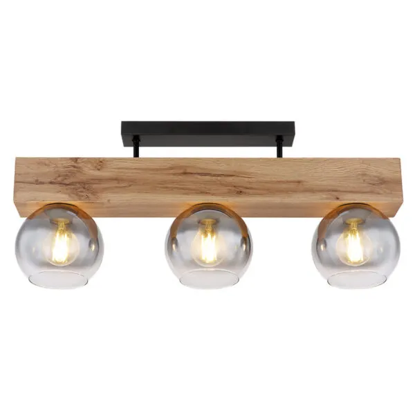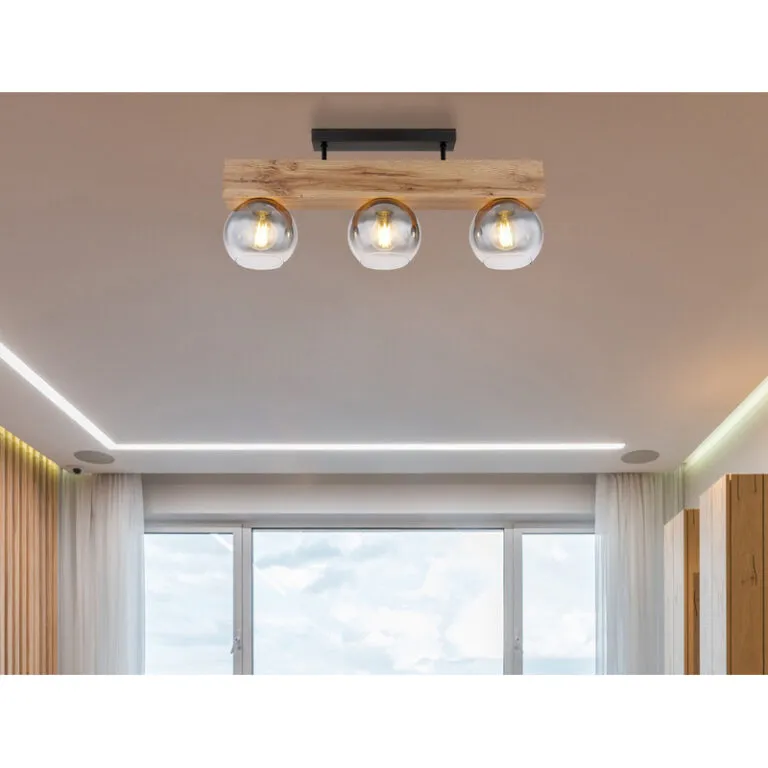 Ova prelepa plafonska lampa MOITAS serije inspiriše sjajnim dizajnom. Dve kratke metalne šipke isturene iz crne pravougaone plafonske osnove pružaju se do grede nalik drvetu (65x15cm). Postoje tri E27 grla , svako sa staklenom kuglom u boji dima. E27 grla vam omogućavaju da se sami odaberete boju svetla i jačinu do maksimalne snage od 40 vati.