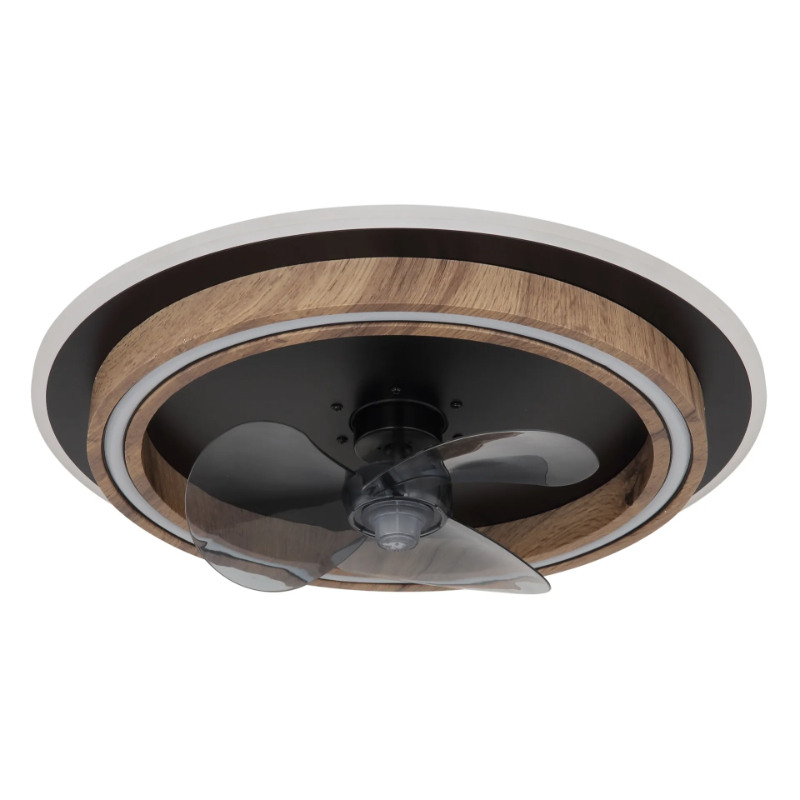 Plafonski ventilator BOZAN 03655.Uživajte u elegantnom plafonskom ventilatoru BOZAN, koji vaše prostorije oprema jedinstvenom kombinacijom osvetljenja i ventilacije. BOZAN se sastoji od okruglog kućišta izrađenog od crnog mat lakiranog metala i MDF-a (vlaknasta ploča srednje gustine) sa tamnim efektom drveta, na koje su pričvršćena tri ravna krila. Osvetljenje obezbeđuje okrugli abažur izrađen od opal i dim plastike.