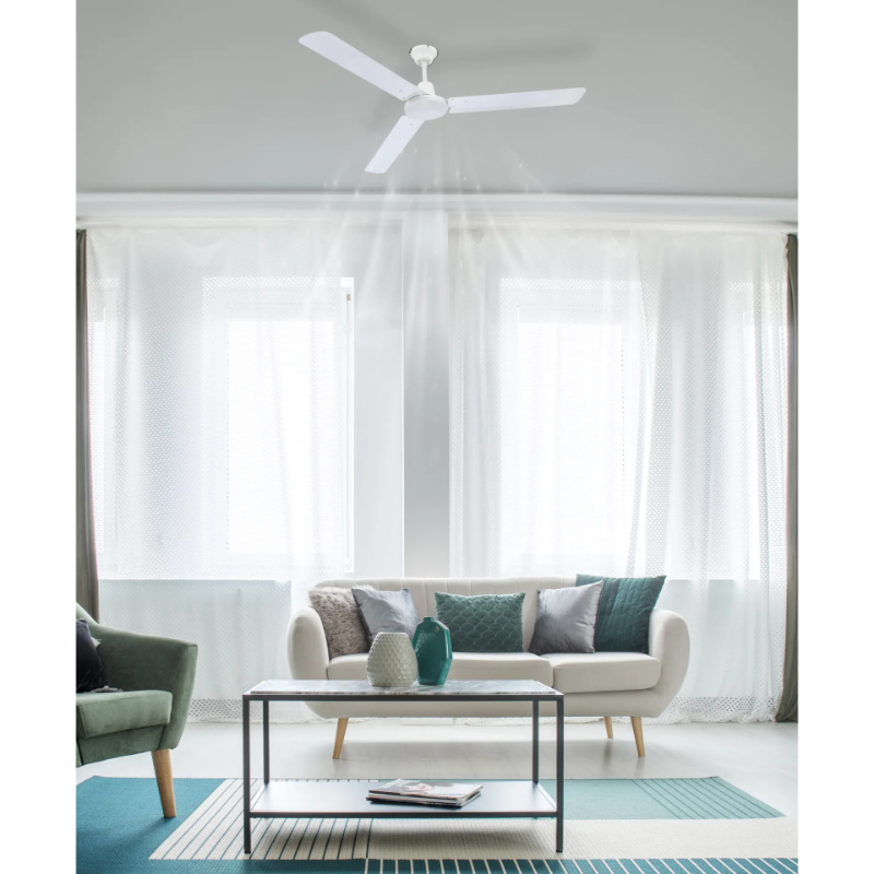 Plafonski ventilator FERRO 0310. Ovaj beli plafonski ventilator obezbeđuje prijatno svež vazduh i zahvaljujući jednostavnom dizajnu bez problema se uklapa u svako okruženje. Za optimalno podešavanje, ventilator poseduje tri različita nivoa brzine. Zbog svojih performansi i veličine (Ø142 cm), može se lako koristiti u prostorijama površine do 30 m2. Maksimalna snaga motora je 70 W.