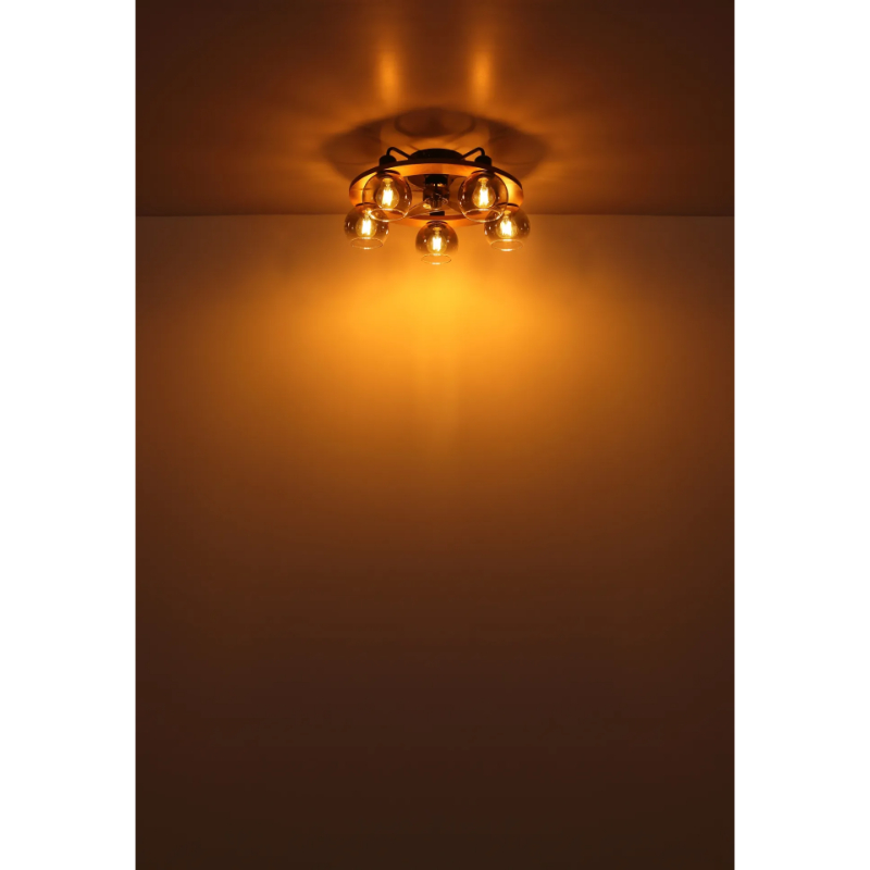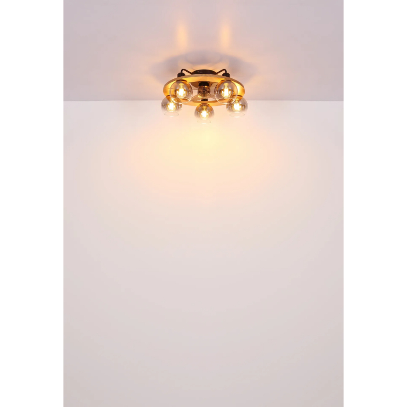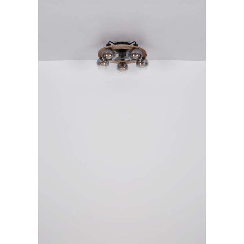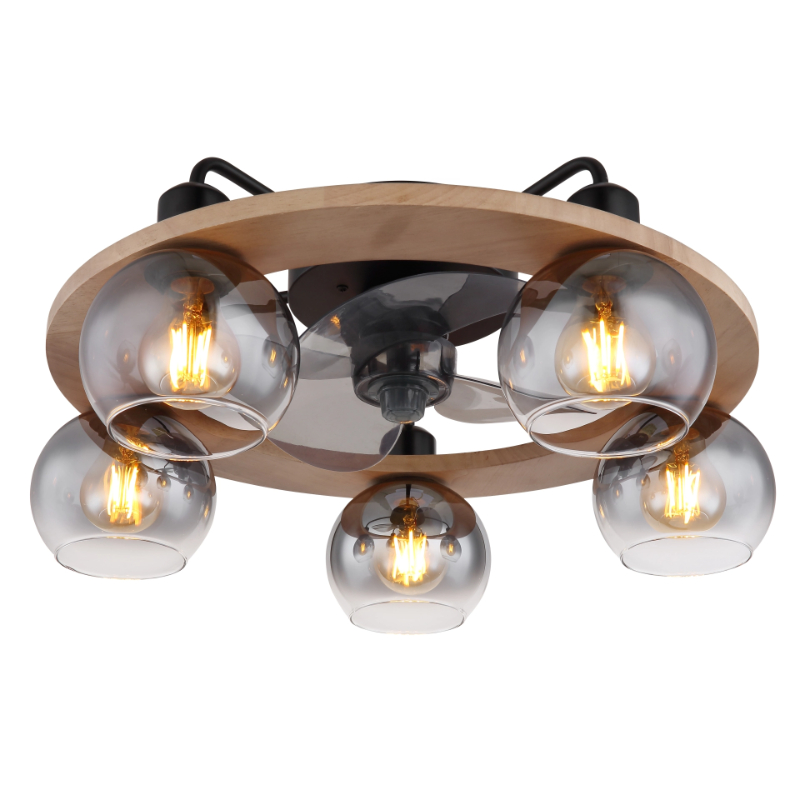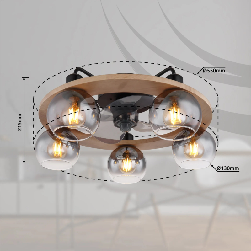 Plafonski ventilator LAMOTTA 03639 kombinuje moderan dizajn sa funkcionalnom svestranošću i stilskim osvetljenjem. Centralno postavljena krila od drveta prirodne boje daju ventilatoru topao i elegantan izgled. Dok mat crno metalno kućište stvara moderan kontrast. Svetlosni izvor okrenut prema dole okružen je abažurom od crne plastike i hromiranog dimljenog stakla, stvarajući prijatan i atmosferičan efekat osvetljenja.