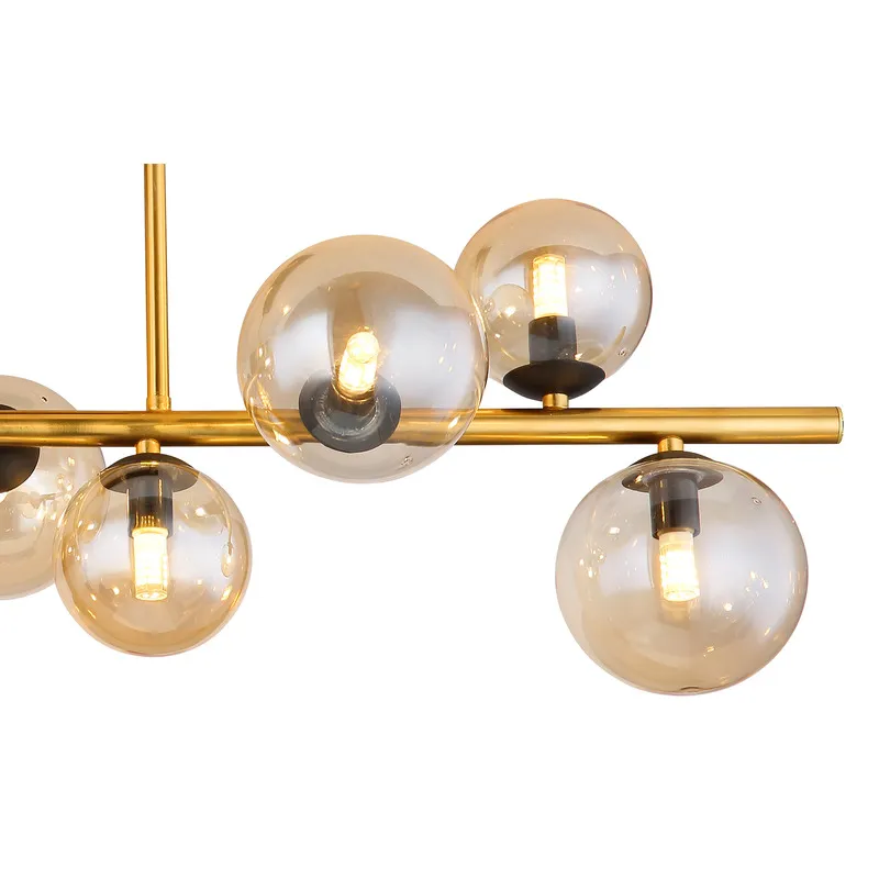 Postavljena na uskom crnom stropnom nosaču, dve šipke u mesinganoj boji kreću se vertikalno do duge metalne šipke od 87 cm (87×30 cm).Ova elegantna svetiljka je opremljena sa devet G9 LED sijalica, a svaka staklena nijansa je u tonu jantarno-žute boje. G9 LED sijalice emituju prijatno toplo belo svetlo od 3000 Kelvina, stvarajući ugodnu atmosferu. Uz ostale modele iz ove serije, možete savršeno upotpuniti vaš dnevni boravak i stvoriti jedinstvenu atmosferu u vašem domu.