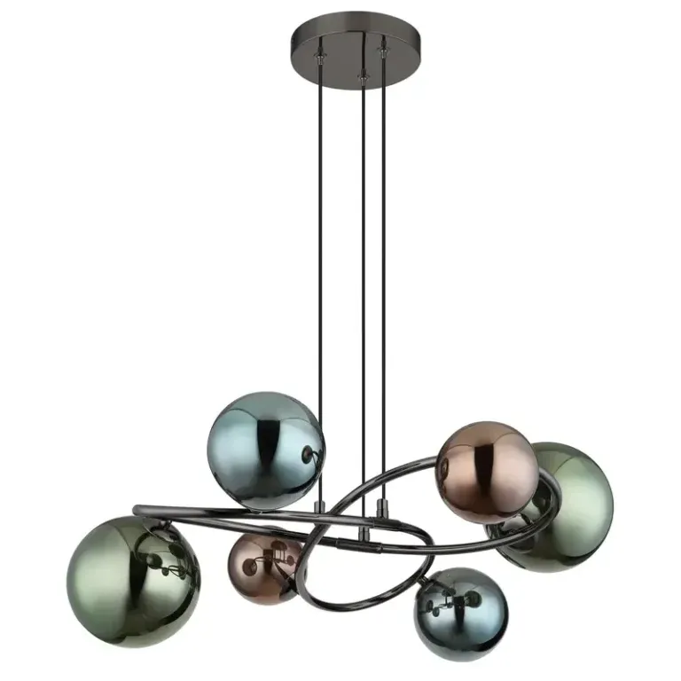 Otkrijte jedinstvenu visilicu RIHA koja će vašim prostorijama pružiti jedinstvenu atmosferu. Dizajn visilice RIHA sastoji se od pravougaonog tela od sive, mat lakirane metalne površine, koje je obavijeno zakrivljenim oblikom. Stakleni abažuri različitih veličina u bronzanoj, zelenoj i petrol plavoj boji stvaraju jedinstvenu sliku i obezbeđuju optičku raznovrsnost. Staklene kugle prečnika 650 mm stvaraju jedinstveno osvetljenje. Sa svetlosnim tokom od 290 lumena, LED svetlo pruža dovoljno osvetljenja. Temperatura boje od 3000K daje visilici RIHA topao i prijatan karakter. Visilica RIHA je savršena za prostore koji žele da ponude jedinstven ambijent i atmosferu udobnosti. Obesite visilicu RIHA na plafon ili balkon i unesite specijalnu svetlost u svoje prostorije.