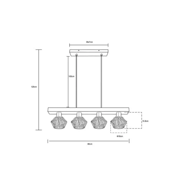 Ovaj prelepi reflektor inspiriše sjajnim dizajnom. Na uskom plafonskom nosaču nalik drvetu (80x16cm) nalaze se četiri crne mat spojnice, svaka sa grlom E27, obavijena mrežastim abažurom od kanapa (Ø15.5cm), okačena je na dva kabla 1.2m od plafona. Grla E27 vam daju mogućnost da sami odaberete sijalicu a samim tim i boju svetla i jačinu (do max. 60W). Sa ostalim modelim ove serije možete upotpuniti sliku u vašem domu.