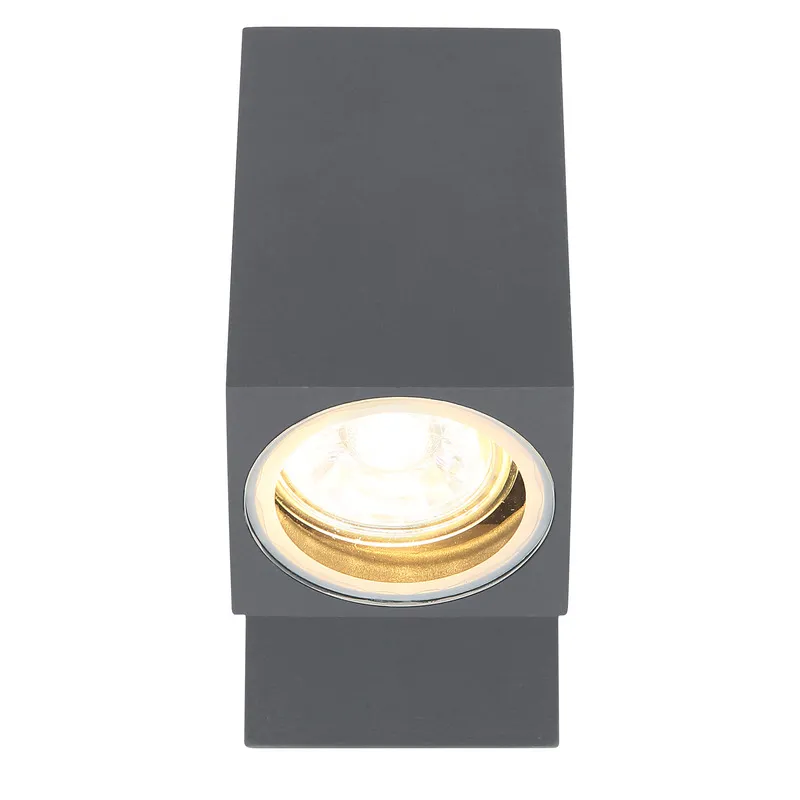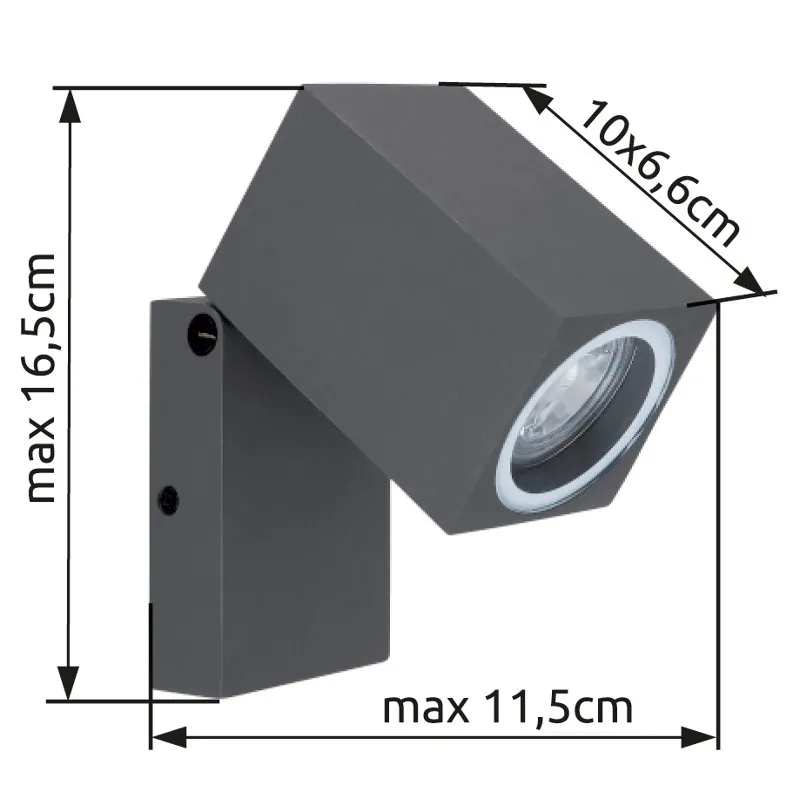 Ova moderna spoljašnja lampa serije VERONIKA impresionira svojim jednostavnim dizajnom od livenog aluminijuma u boji antracita. Lampa od 16.5cm se sastoji od aluminijumskog zidnog nosača na koji je pričvršćen pokretni aluminijumski kvadar. On može biti opremljen GU10 sijalicom po vašem izboru, koja je prekrivena providnim staklom. Ona vam daje priliku da pojedinačno odredite boju svetla i jačinu. Sa drugim modelima ove serije možete upotpuniti sliku u vašem prostoru.