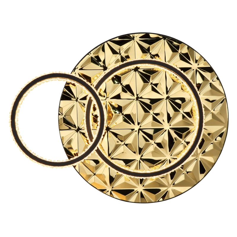 Telo izrađeno od mat crnog metala i nerđajućeg čelika u zlatnoj boji daje lampi elegantan i luksuzan karakter. Senka od mat crnog aluminijuma obezbeđuje ravnomerno širenje svetlosti, dok providni plastični kristali stvaraju zanimljive svetlosne refleksije i dodatno naglašavaju prefinjenost dizajna.